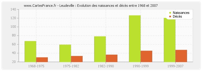 Leudeville : évolution des naissances et décès de 1968 à 2007