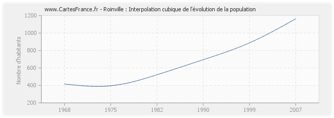 Cette courbe reprend l'historique de la population de Roinville de 1968 à 2007 en interpolation cubique. Ceci permet d'obtenir plus précisément la population de la commune de Roinville les années ou aucun recensement n'a été effectué.