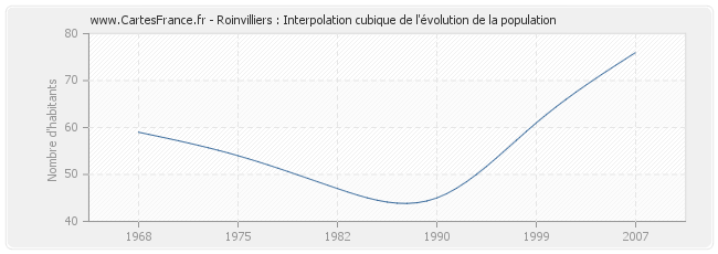 Cette courbe reprend l'historique de la population de Roinvilliers de 1968 à 2007 en interpolation cubique. Ceci permet d'obtenir plus précisément la population de la commune de Roinvilliers les années ou aucun recensement n'a été effectué.