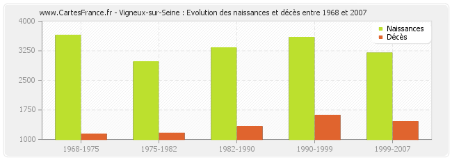 Vigneux-sur-Seine : évolution des naissances et décès de 1968 à 2007