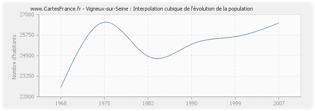 Cette courbe reprend l'historique de la population de Vigneux-sur-Seine de 1968 à 2007 en interpolation cubique. Ceci permet d'obtenir plus précisément la population de la commune de Vigneux-sur-Seine les années ou aucun recensement n'a été effectué.