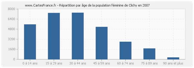 Répartition de la population féminine de Clichy par âge en 2007 :