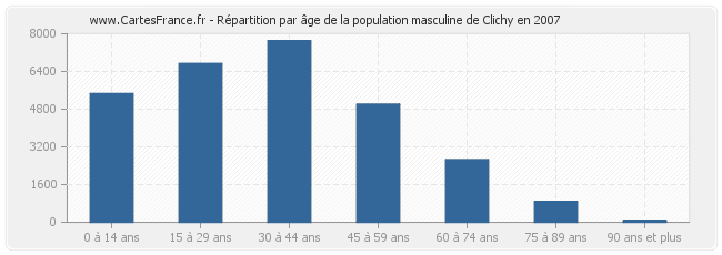 Répartition de la population masculine de Clichy par âge en 2007 :