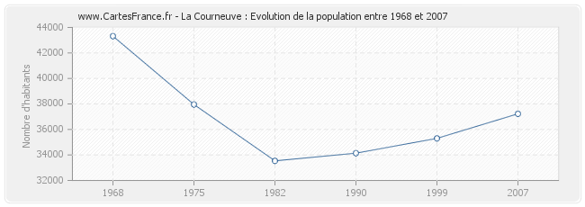 La population de La Courneuve était de 37 228 habitants en 2007, 35 301 habitants en 1999, 34 139 habitants en 1990, 33 537 habitants en 1982, 37 958 habitants en 1975 et 43 318 habitants en 1968.