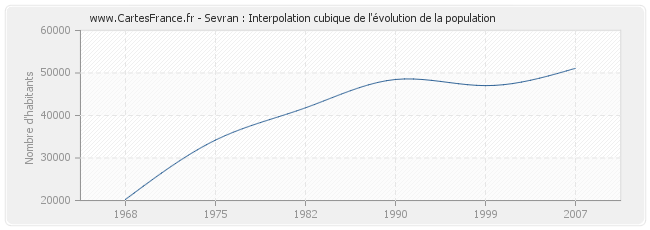 Cette courbe reprend l'historique de la population de Sevran de 1968 à 2007 en interpolation cubique. Ceci permet d'obtenir plus précisément la population de la commune de Sevran les années ou aucun recensement n'a été effectué.