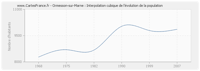 Cette courbe reprend l'historique de la population d'Ormesson-sur-Marne de 1968 à 2007 en interpolation cubique. Ceci permet d'obtenir plus précisément la population de la commune d'Ormesson-sur-Marne les années ou aucun recensement n'a été effectué.