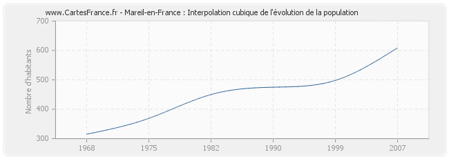 Cette courbe reprend l'historique de la population de Mareil-en-France de 1968 à 2007 en interpolation cubique. Ceci permet d'obtenir plus précisément la population de la commune de Mareil-en-France les années ou aucun recensement n'a été effectué.