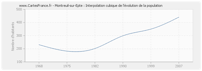 Cette courbe reprend l'historique de la population de Montreuil-sur-Epte de 1968 à 2007 en interpolation cubique. Ceci permet d'obtenir plus précisément la population de la commune de Montreuil-sur-Epte les années ou aucun recensement n'a été effectué.