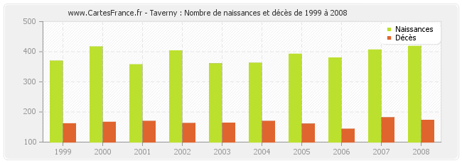 - Taverny en 2008 : 418 naissances et 172 décès