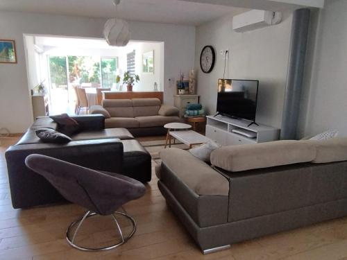 L’hébergement Villa Le Chêne Vert se trouve à Arès, à seulement 1,2 km de ce lieu d’intérêt : Plage de La Conche Saint-Brice. Il propose une piscine extérieure ouverte en saison, une terrasse et un service de concierge. Cette maison de vacances comprend une piscine privée, un jardin, un barbecue, un parking privé gratuit et une connexion Wi-Fi gratuite. Cette maison de vacances avec climatisation se compose de 5 chambres, d'un salon, d'une cuisine entièrement équipée avec un réfrigérateur et une machine à café, ainsi que de 2 salles de bains avec une douche et une baignoire. Une télévision à écran plat avec les chaînes du câble et une console de jeux sont disponibles. L’établissement possède une aire de jeux pour enfants. Vous séjournerez à respectivement 35 km et 36 km de ces lieux d’intérêt : Parc d’attractions La Coccinelle et Kid Parc - Île d’aventures. L'aéroport le plus proche (Aéroport de Bordeaux-Mérignac) est à 33 km. |