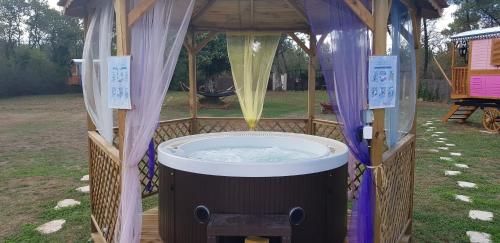L’établissement Roulottes Au Bois Chéri se trouve à Bussac-Forêt. Offrant une vue sur le jardin, il propose une connexion Wi-Fi gratuite, un jardin avec une piscine extérieure, ainsi qu’un sauna et un bain à remous. Les hébergements sont dotés de la climatisation et d’un bain à remous. L’établissement propose des hébergements avec vue sur la piscine, une terrasse, un coin salon et une télévision à écran plat par câble. Vous bénéficierez d’une kitchenette entièrement équipée avec un réfrigérateur et un micro-ondes, ainsi que d'une salle de bains privative avec une douche et des articles de toilette gratuits. Une plaque de cuisson et une machine à café sont également disponibles. Un petit-déjeuner continental est servi sur place. Cet établissement dispose d’un barbecue. Après une journée de randonnée ou de vélo, vous pourrez vous détendre dans le salon commun. L'aéroport le plus proche (Aéroport de Bordeaux-Mérignac) est à 65 km. |