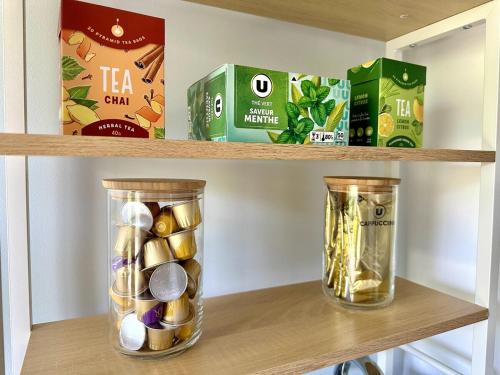 Appartement 1 Chambre    This apartment consists of a kitchen, a seating area, 1 separate bedroom and 1 bathroom with a shower and a hairdryer. The well-fitted kitchen features a stovetop, a refrigerator, kitchenware and a microwave. The apartment provides a tea and coffee maker, a dining area, a sofa, a flat-screen TV, as well as a quiet street view. The unit offers 1 bed. | ||