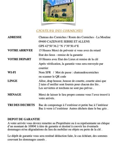 Informations importantes | Veuillez informer l\'établissement Fraîcheur garantie château perché avec rivière privée en pleine nature à l\'avance de l\'heure à laquelle vous prévoyez d\'arriver. Vous pouvez indiquer cette information dans la rubrique « Demandes spéciales » lors de la réservation ou contacter directement l\'établissement. Ses coordonnées figurent sur votre confirmation de réservation. Un dépôt de garantie d\'un montant de EUR 500 est demandé à l\'arrivée. Il devra être payé en espèces. Le remboursement devrait être effectué le jour de votre départ. Le dépôt de garantie vous sera entièrement remboursé en espèces, si aucun dommage n\'a été constaté par l\'établissement. Hébergement géré par un particulier |