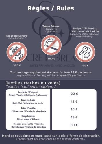 Informations importantes | Les enterrements de vie de célibataire et autres fêtes de ce type sont interdits dans cet établissement. Vous devrez effectuer un virement bancaire avant votre arrivée. L'établissement vous contactera après votre réservation pour vous donner plus d'informations. Un dépôt de garantie d'un montant de EUR 350 est demandé. Votre hôte le débitera 7 jours avant votre arrivée. Il devra être payé par carte de crédit. Le remboursement devrait être effectué dans les 7 jours qui suivent votre départ. Le dépôt de garantie vous sera entièrement remboursé par virement bancaire, si aucun dommage n'a été constaté par l'établissement. |