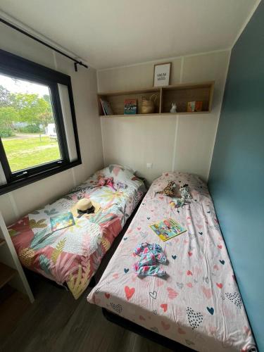 Mobile Home 2 Chambres Premium - 6 Personnes        Ce mobile home comprend un salon, 2 chambres séparées, ainsi qu’une salle de bains pourvue d’une douche. La cuisine entièrement équipée est munie de plaques de cuisson, d’un réfrigérateur, d’un lave-vaisselle et d’ustensiles de cuisine. Le mobile home dispose d’une machine à café, d’un coin salon, d’une terrasse et d’un coin repas extérieur. Ce logement comporte 4 lits. | ||