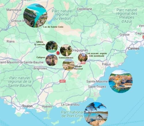 L’hébergement La Maison des Roches' Casteaux se trouve à Entrecasteaux, à respectivement 50 km et 50 km de ces lieux d’intérêt : Le Pont des Fées et Penitents Chapel. Il dispose de la climatisation. Cet hébergement met à votre disposition une table de ping-pong et une connexion Wi-Fi gratuite. Cette maison de vacances compte 1 chambre, une cuisine avec un réfrigérateur et un micro-ondes, une télévision à écran plat, un coin salon, ainsi que 1 salle de bains comportant une baignoire. Le personnel de la réception se tient en permanence à votre disposition pour toute question. L'aéroport le plus proche (Aéroport de Toulon - Hyères) est à 80 km. |