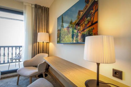 L’établissement Hôtel Terra Vinum vous accueille à Gueberschwihr, à 10 km de ce lieu d’intérêt : Gare de Colmar. Il comprend un salon commun, une terrasse, un bar et un parking privé gratuit. Tous les hébergements de cet hôtel 3 étoiles offrent une vue sur la montagne. Vous pourrez profiter de l’accès à une piscine intérieure et à un sauna. Cet hôtel possède un spa, un service d'étage et une connexion Wi-Fi gratuite dans l’ensemble de ses locaux. Les hébergements sont dotés de la climatisation, d’un bureau, d’une bouilloire, d’un coffre-fort, d’une télévision à écran plat et d’une salle de bains privative avec une douche. Les hébergements disposent d'articles de toilette gratuits, et certains comprennent également un coin salon. Des serviettes et du linge de lit sont fournis. Un petit-déjeuner buffet, continental et sans gluten est servi sur place. Lors de votre séjour, vous pourrez pratiquer diverses activités à Gueberschwihr et dans les environs, telles que la randonnée et le vélo. Vous séjournerez à respectivement 11 km et 12 km de ces lieux d’intérêt : Maison des Têtes et Collégiale Saint-Martin. L'aéroport le plus proche (EuroAirport Mulhouse) est à 51 km. |