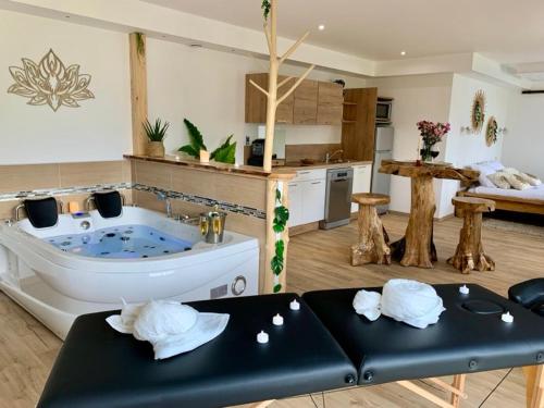 ![]() ![]() This suite boasts a hot tub, spa bath and sauna. Featuring a private entrance, this suite consists of 1 living room, 1 separate bedroom and 1 bathroom with a shower and a hairdryer. In the kitchen, guests will find a stovetop, a refrigerator, a dishwasher and kitchenware. Boasting a terrace with garden views, this suite also provides soundproof walls and a flat-screen TV. The unit offers 1 bed. |