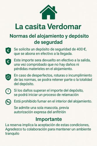 Informations importantes | Les enterrements de vie de célibataire et autres fêtes de ce type sont interdits dans cet établissement. Veuillez informer l\'établissement La Maison Verdemar à l\'avance de l\'heure à laquelle vous prévoyez d\'arriver. Vous pouvez indiquer cette information dans la rubrique « Demandes spéciales » lors de la réservation ou contacter directement l\'établissement. Ses coordonnées figurent sur votre confirmation de réservation. Vous devrez présenter une pièce d\'identité avec photo et une carte de crédit lors de l\'enregistrement. Veuillez noter que toutes les demandes spéciales seront satisfaites sous réserve de disponibilité et pourront entraîner des frais supplémentaires. Les clients âgés de moins de 18 ans doivent être accompagnés d\'un parent ou d\'un tuteur légal pour pouvoir s\'enregistrer. Hébergement géré par un particulier |