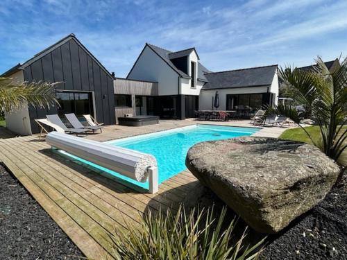 L’hébergement en bord de mer Villa Soizic se situe à La Terre du Pont, à seulement 300 mètres de ce lieu d’intérêt : Plage des Chardons Bleus. Il possède une piscine extérieure ouverte en saison, un jardin et une connexion Wi-Fi gratuite. Cette villa possède un parking privé gratuit et se trouve dans une région où vous pourrez pratiquer des activités telles que la randonnée et le ping-pong. Disposant d’une terrasse et offrant une vue sur la piscine, cette villa comprend 4 chambres, un salon, une télévision à écran plat, une cuisine équipée avec un réfrigérateur et un lave-vaisselle, ainsi que 3 salles de bains avec une douche. Des serviettes et du linge de lit sont à disposition. L’établissement Villa Soizic dispose d’un bain à remous. Vous séjournerez à respectivement 45 km et 44 km de ces lieux d’intérêt : Musée national de la Marine, Brest et Centre de culture scientifique Océanopolis. L'aéroport le plus proche (Aéroport Brest Bretagne) est à 34 km. |