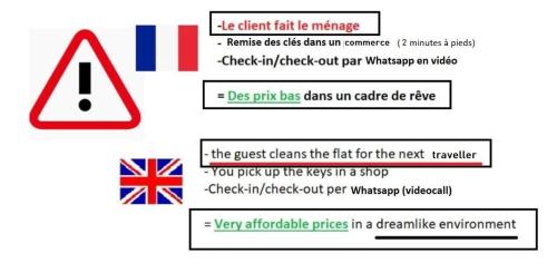 Informations importantes | Veuillez informer l\'établissement VUE DE REVE chambre dans APPARTEMENT DE STANDING - vous faites le ménage-Very good prices but you have to cle-an th-e flat à l\'avance de l\'heure à laquelle vous prévoyez d\'arriver. Vous pouvez indiquer cette information dans la rubrique « Demandes spéciales » lors de la réservation ou contacter directement l\'établissement. Ses coordonnées figurent sur votre confirmation de réservation. Si vous causez des dommages dans l\'hébergement pendant votre séjour, il se peut que vous deviez payer jusqu\'à EUR 300 après votre départ, conformément aux conditions relatives au dépôt de garantie de cet hébergement. |