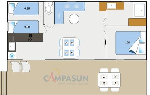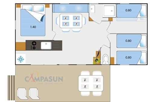 ![]() ![]() ![]() ![]() ![]() ![]() This air-conditioned mobile home is comprised of 1 living room, 3 separate bedrooms and 1 bathroom with a shower. The well-equipped kitchen features a stovetop, a refrigerator, a dishwasher and kitchenware. Featuring a terrace, this mobile home also offers a coffee machine, a seating area and a flat-screen TV with satellite channels. The unit offers 5 beds. |