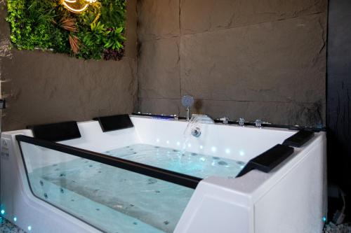 ![]() ![]() ![]() ![]() ![]() This apartment's standout features are the hot tub, spa bath and fireplace. This spacious apartment includes 1 living room, 2 separate bedrooms and 2 bathrooms with a walk-in shower and free toiletries. Meals can be prepared in the kitchen, which is fitted with a stovetop, a refrigerator, kitchenware and an oven. This apartment is air-conditioned and has a seating area with a flat-screen TV, a washing machine, soundproof walls, a tea and coffee maker, as well as a dining area. The unit has 3 beds.  |