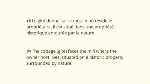 Informations importantes | Les enterrements de vie de célibataire et autres fêtes de ce type sont interdits dans cet établissement. Veuillez informer l\'établissement Gîte du Moulin de Maître Pierre à l\'avance de l\'heure à laquelle vous prévoyez d\'arriver. Vous pouvez indiquer cette information dans la rubrique « Demandes spéciales » lors de la réservation ou contacter directement l\'établissement. Ses coordonnées figurent sur votre confirmation de réservation. Les clients âgés de moins de 18 ans doivent être accompagnés d\'un parent ou d\'un tuteur légal pour pouvoir s\'enregistrer. Hébergement géré par un particulier |