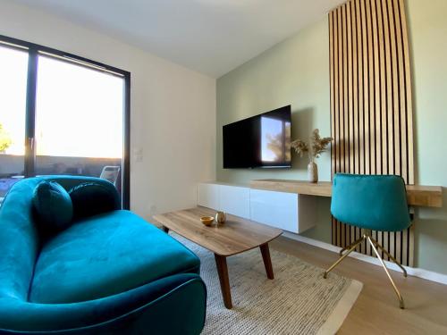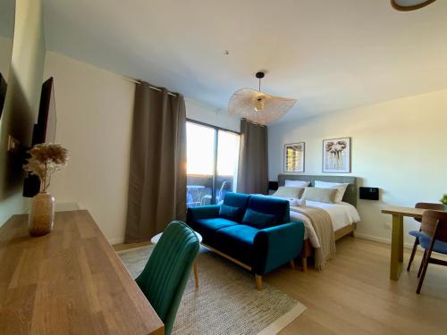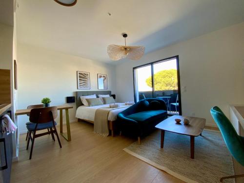 Studio avec Terrasse    The studio has a private bathroom, air conditioning, a washing machine, as well as a seating area with a flat-screen TV. In the kitchen, guests will find a stovetop, a refrigerator, a microwave and a toaster. The studio offers a wardrobe, an electric kettle, a sofa, parquet floors and a TV. The unit has 1 bed. | ||