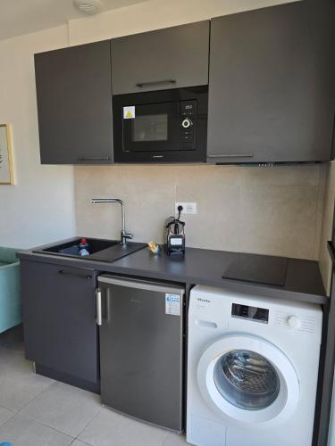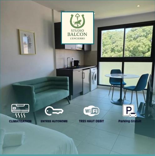 Studio avec Balcon     The studio provides a wardrobe, a dressing room, as well as a private bathroom featuring a shower and a hairdryer. Guests can make meals in the kitchen that is equipped with a stovetop, a refrigerator, kitchenware and a microwave. This studio is air-conditioned and features a seating area with a flat-screen TV, a washing machine, a private entrance, a coffee machine, as well as a dining area. The unit offers 1 bed. | ||