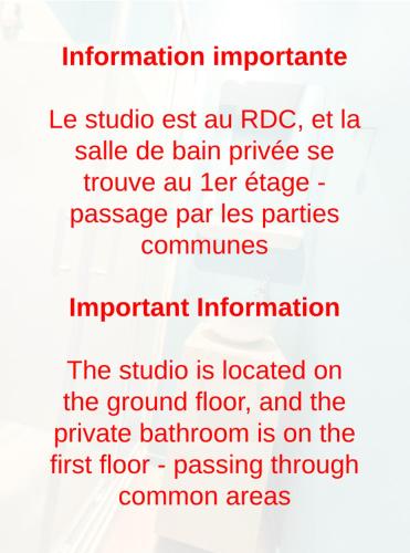 Informations importantes | Les enterrements de vie de célibataire et autres fêtes de ce type sont interdits dans cet établissement. Les clients âgés de moins de 18 ans doivent être accompagnés d\'un parent ou d\'un tuteur légal pour pouvoir s\'enregistrer. Si vous causez des dommages dans l\'hébergement pendant votre séjour, il se peut que vous deviez payer jusqu\'à EUR 300 après votre départ, conformément aux conditions relatives au dépôt de garantie de cet hébergement. PLEASE NOTE - the bathroom is not attached to the Studio. Access via common areas to access the bathroom located on the 1st floor. The bathroom is very private. Hébergement géré par un particulier |