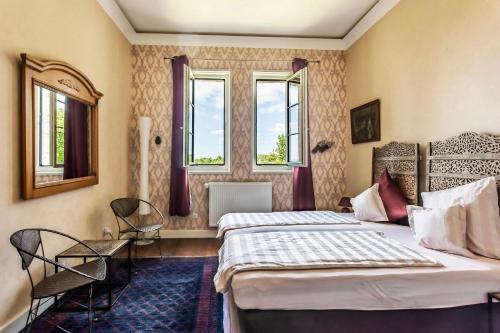 ![]() ![]() This 17 m2 double/twin bedroom (as required) with seating area, air conditioning and safe is located in the castle tower with a view of the castle park. The private bathroom with bathtub and shower, hairdryer, bathrobe and toiletries is located on the same floor. The bedroom is equipped with a flat-screen TV with streaming services and WiFi, a fridge and a kettle for tea and coffee. Guests have access to a furnished 25 m2 terrace on the first floor of the castle with a marvellous view over the park, the heated outdoor pool (12x6 m2) and the games room (100 m2). |