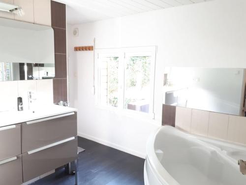 L’hébergement en bord de mer Maison au calme sur grand terrain avec piscine vous accueille à Saint-Vivien-de-Médoc, à seulement 20 km de ce lieu d’intérêt : Estuaire de la Gironde. Il comprend une piscine extérieure ouverte en saison, un jardin, un bar et une connexion Wi-Fi gratuite. Cet hébergement met à votre disposition une piscine privée et un parking privé gratuit. Disposant d’une terrasse et offrant une vue sur la piscine, cette maison de vacances possède 1 chambre, un salon, une télévision à écran plat, une cuisine équipée avec un réfrigérateur et un lave-vaisselle, ainsi que 2 salles de bains avec une douche. Des serviettes et du linge de lit moyennant des frais supplémentaires. Vous séjournerez à 13 km de ce lieu d’intérêt : Basilique Notre-Dame de la Fin des Terres. L'aéroport le plus proche (Aéroport de Bordeaux-Mérignac) est à 80 km. |