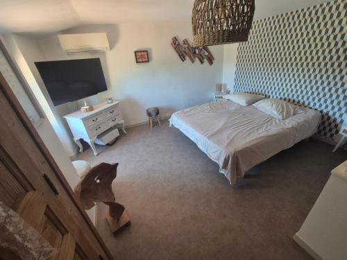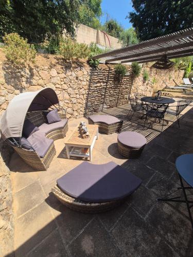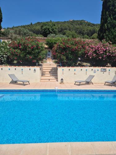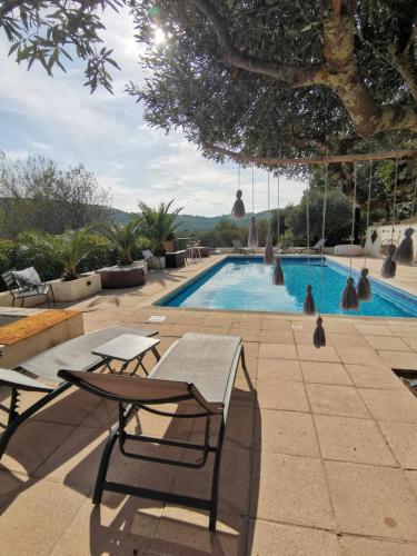 ![]() ![]() ![]() ![]() ![]() ![]() Magnificent fully equipped 56m2 apartment on the 1st floor of the property with a beautiful 12m2 Tropézienne terrace,enjoying an exceptional and panoramic view of the valley and the swimming pool with direct access. Private entrance for this independent accommodation. The apartment is furnished and fully equipped indoor/outdoor. Composed of a kitchen open to the living space and 2 bedrooms, one with a double bed and the other with 2 single beds. Sofa bed for 2 people at extra cost in the living room, separate shower room with toilet. Available to tenants: attic terrace, bowling alley and swimming pool access during opening periods. It has a large south-facing terrace as well as a breathtaking view. |