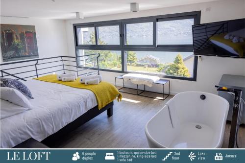 Duplex Apartment with Lake View and Spa - Le Loft        Offrant une vue sur la montagne, l'appartement dispose d'un coin salon avec télévision à écran plat, lecteur DVD et haut-parleur Bluetooth, d'une commode, d'une cuisine entièrement équipée et de matériel de repassage. L’hébergement comprend également 2 salles de bains, une avec baignoire face au lac d'Annecy et une avec douche à l'italienne. | ||