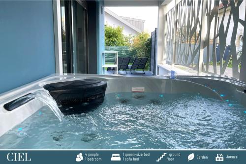 Garden Level One-Bedroom Apartment with Spa - Ciel      L'appartement dispose d'un coin salon avec télévision à écran plat, lecteur DVD et haut-parleur Bluetooth, d'une commode, d'une cuisine entièrement équipée et de matériel de repassage. La salle de bains privative est pourvue d'une douche à l'italienne et d'un sèche-cheveux. L’hébergement est adapté aux personnes à mobilité réduite. | ||