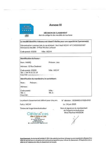 Informations importantes | Les enterrements de vie de célibataire et autres fêtes de ce type sont interdits dans cet établissement. Veuillez informer l\'établissement VENI VEDI VICHY climatisé, 50m2 coeur de ville à l\'avance de l\'heure à laquelle vous prévoyez d\'arriver. Vous pouvez indiquer cette information dans la rubrique « Demandes spéciales » lors de la réservation ou contacter directement l\'établissement. Ses coordonnées figurent sur votre confirmation de réservation. Hébergement géré par un particulier |
