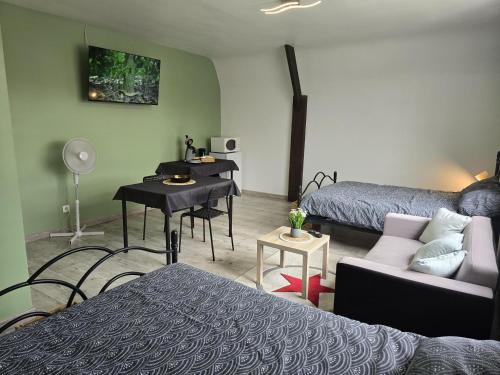 Chambre Double The double room provides a tea and coffee maker, a seating area, as well as a shared bathroom featuring a shower and a hairdryer. The double room offers a dining area, parquet floors, a carpeted floor, heating and a flat-screen TV. The unit offers 1 bed.